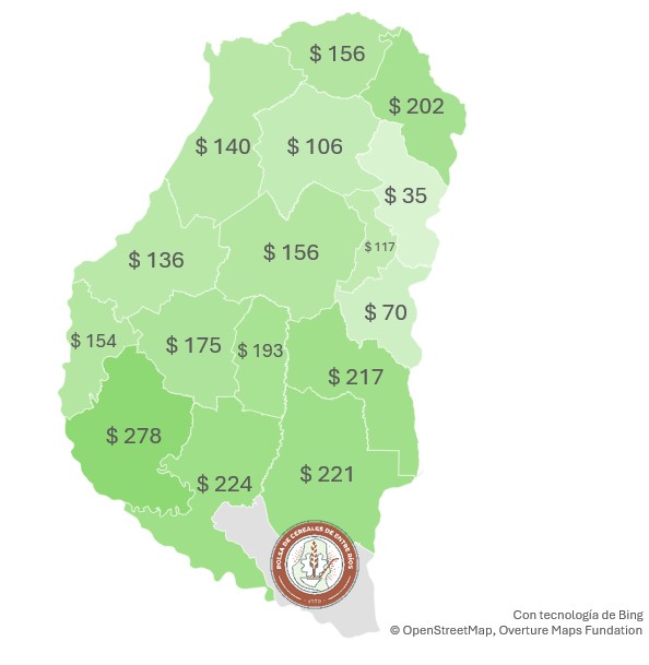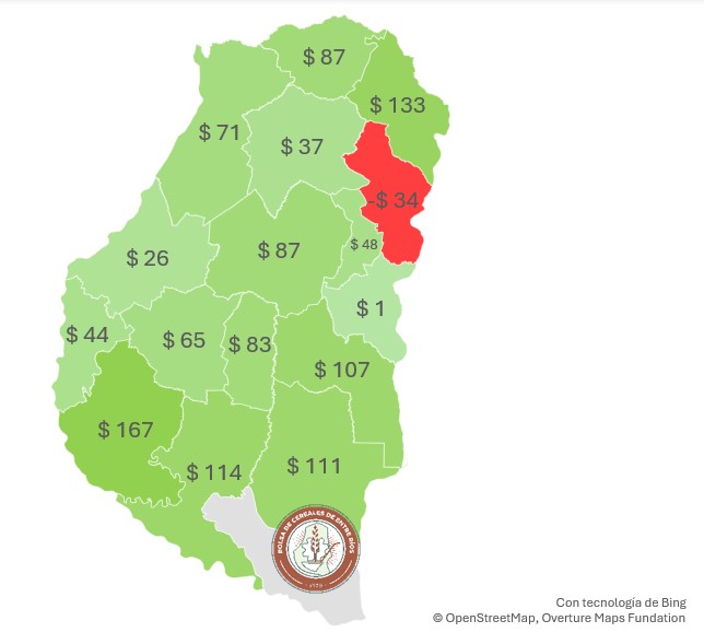 Figura 2. Márgenes brutos con arrendamiento por departamento en la campaña 2025/26 de trigo en Entre Ríos.
