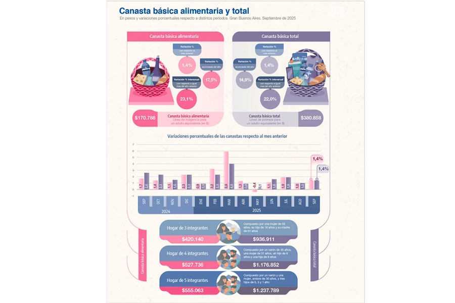 Indec: una familia requirió más de $1.170.000 para no ser pobre. El costo de las canastas básicas se aceleró en septiembre al 1,4%. Aun así, los aumentos se mantuvieron por debajo de la inflación general. Por tercer mes consecutivo, tanto la Canasta Básica Alimentaria como la Canasta Básica Total arrojaron la misma variación.