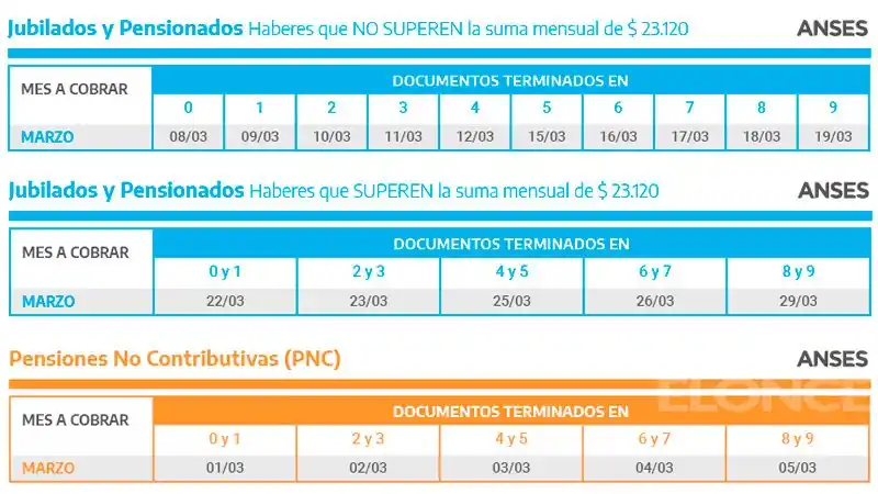 Mientras que los jubilados que perciben haberes superiores a $ 23.120 con DNI terminado en 0 y 1 cobrarán el 22 de marzo.