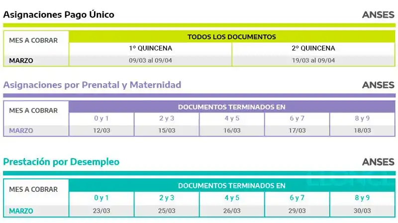 Por otra parte, la Prestación por Desempleo se abonará a los beneficiarios con DNI finalizado en 0 y 1: 23 de marzo.