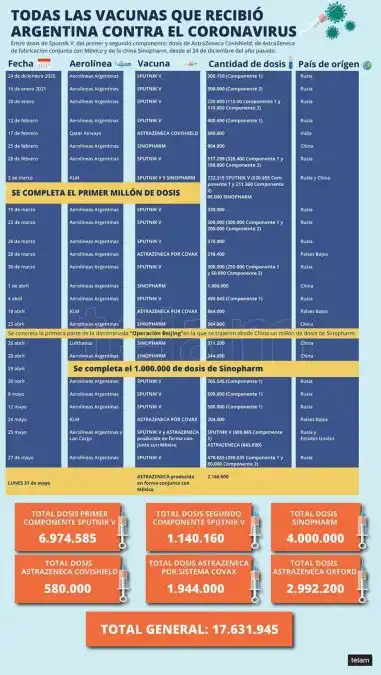 De esta manera, ingresaron al país 6.974.585 dosis del primer componente de la Sputnik V; 1.140.160 del segundo componente de la misma vacuna; 4.000.000 de la Sinopharm; 580.000 de AstraZeneca Covishield; 1.944.000 de AstraZeneca por el sistema Covax; y 843.600 de AstraZeneca Oxford, que se convertirán en 2.992.200 con las que llegan el lunes.
