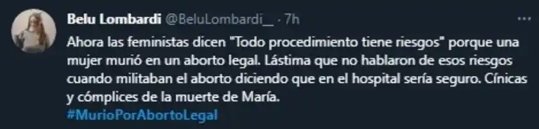 "Ahora las feministas dicen "Todo procedimiento tiene riesgos" porque una mujer murió en un aborto legal. Lástima que no hablaron de esos riesgos cuando militaban el aborto diciendo que en el hospital sería seguro. Cínicas y cómplices de la muerte de María", fue uno de los mensajes que se viralizó en medio de la polémica.