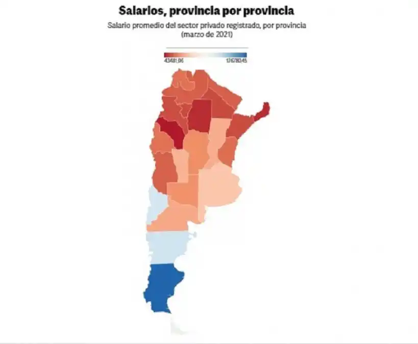 Los datos se desprenden de un informe publicado por el Ministerio de Trabajo de la Nación. De acuerdo al estudio, el sueldo promedio neto a nivel nacional fue de $71.363 en marzo de 2021 (dato más actual). En la cima del ranking se ubica Santa Cruz, con un ingreso medio per cápita de $126.780. Le siguen de cerca Chubut ($99.330) y Neuquén ($98.129). En el otro extremo se ubican las provincias de Misiones ($45.118), Santiago del Estero ($45.100) y La Rioja ($43.481).