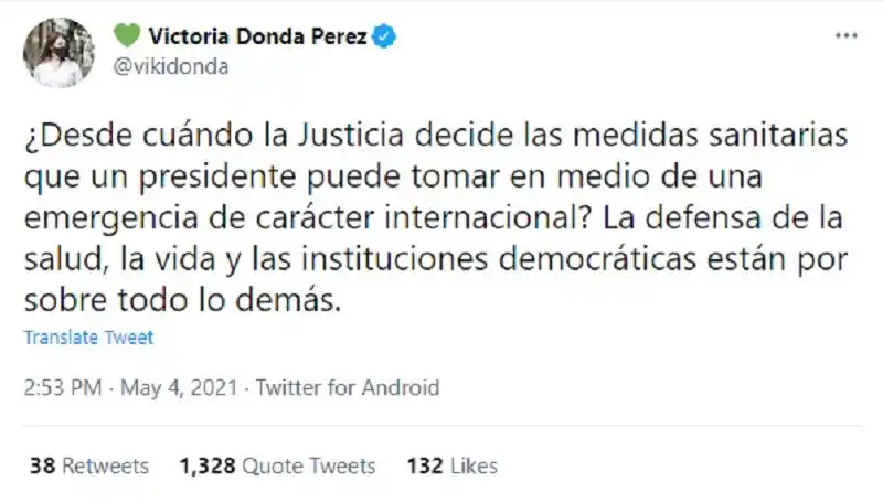 La titular del INADI utilizó sus redes sociales para pronunciarse al respecto de la vuelta a la presencialidad de las clases. En el proceso no se privó en criticar a la Corte Suprema de Justicia por la decisión que tomó con su fallo. "¿Desde cuándo la Justicia decide las medidas sanitarias que un presidente puede tomar en medio de una emergencia de carácter internacional?", comenzó escribiendo en el tweet.