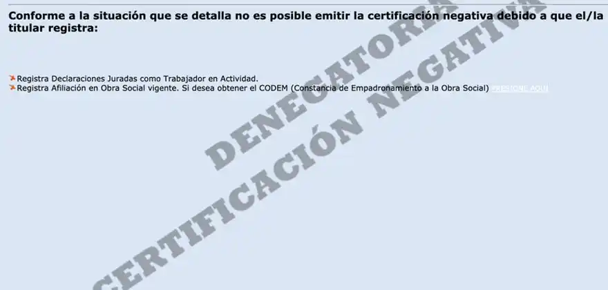Una vez ingresados los datos, el sistema de Anses indicará si es posible acceder a la compra de dólares. El mensaje "Denegatoria Certificación Negativa" indica que la persona sí está habilitada a comprar dólares. A continuación se muestra un ejemplo: