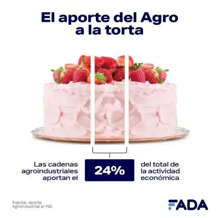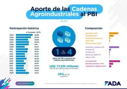"Las cadenas agro generan 1 de cada 4 pesos que produce el país. El 24% del PBI argentino proviene del campo, son USD 77.235 millones, es la actividad que mayor aporte genera. Le siguen en importancia: el comercio mayorista y minorista de otros productos (12%), como ropa, calzado, electrodomésticos, la actividad inmobiliaria (11%), salud y educación (11%) y la industria manufacturera de productos como autos, prendas de vestir, maquinarias, etc. (10%)", agregó David Miazzo, Economista Jefe de FADA.