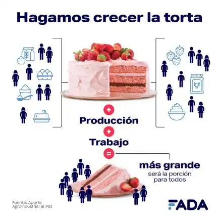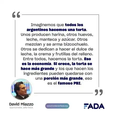 "Imaginemos que todos los argentinos hacemos una torta. Unos producen harina, otros huevo, leche, manteca y azúcar. Algunos con la leche y el azúcar elaboran el dulce de leche. Además, hay quienes con harina, aceite, azúcar y leche preparan el bizcochuelo, otros se encargan de la crema y las frutillas del relleno. Entre todos, hacen la torta. Eso es la economía. Si la economía crece, la torta se hace más grande y hay más probabilidad que todos los que hacen los ingredientes puedan quedarse con una porción más grande. Si esa torta se achica, cae la economía, cae la actividad económica y hay más probabilidad que nos quedemos con una porción menor de esa torta", ejemplificó Miazzo.