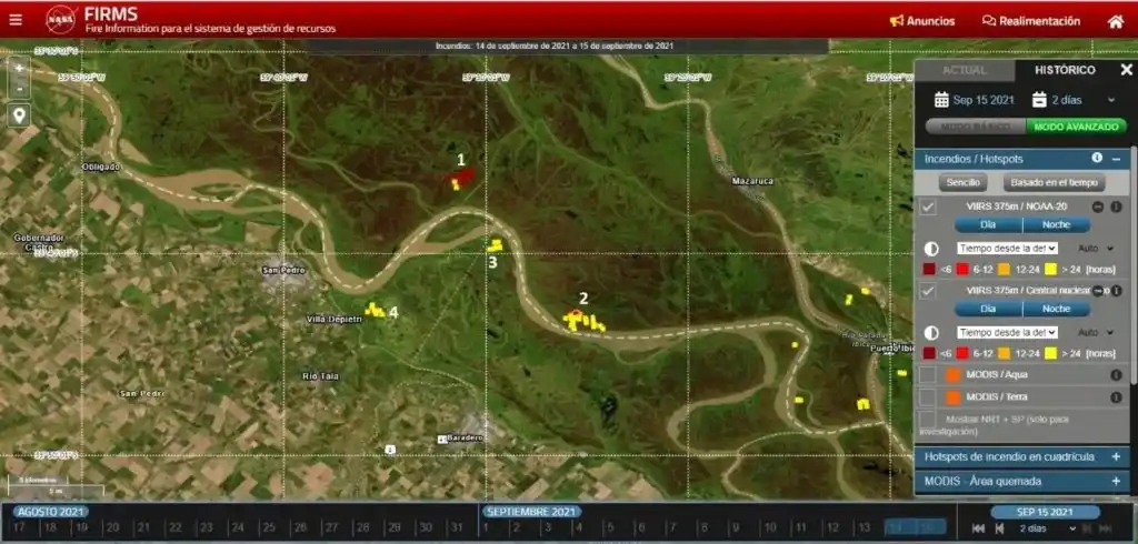 Sierra reportó que se registraron 10 focos entre el canal colector y el canal 2, a la latura del km 262 del río Paraná, y otros 15 a la altura del km 248, "casi frente a la isla de Los Laureles", en Lechiguanas, departamento de Gualeguay, provincia de Entre Ríos.