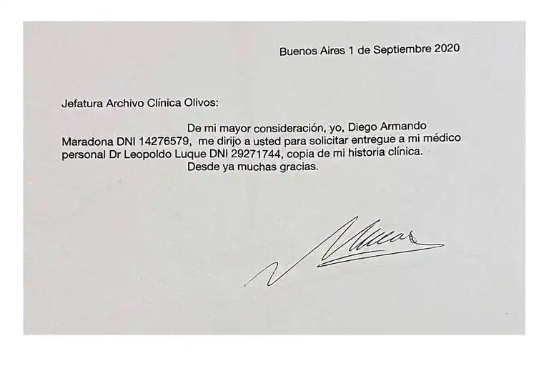 En el documento que fue peritado en las últimas horas, se observa un texto dirigido a la jefatura de archivo de la Clínica Olivos fechado el 1 de septiembre de 2020 con el siguiente texto: "De mi mayor consideración yo, Diego Armando Maradona, me dirijo a usted para solicitar entregue a mi médico personal Dr. Leopoldo Luque, copia de mi historia clínica. Desde ya, muchas gracias". Debajo del texto aparece una firma de Maradona. Las historias clínicas son exclusivas de los pacientes y nadie más que ellos las pueden pedir y deben hacerlo a través de un documento firmado. Ahora se sabe que eso se intentó hacer de manera ilegal sin el consentimiento del Diez.