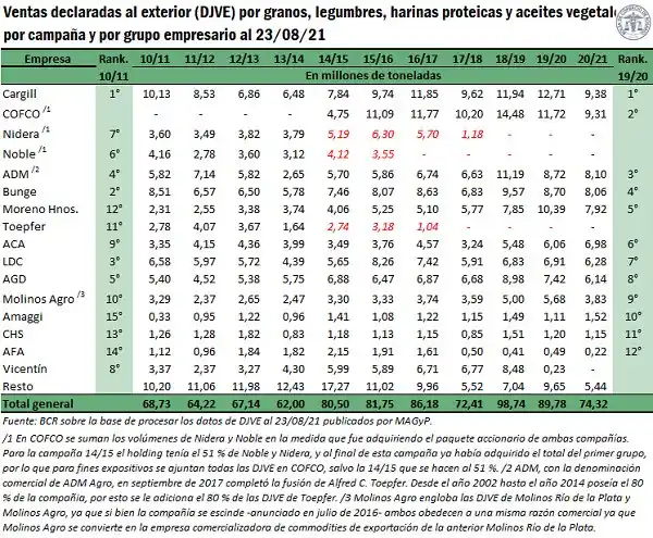 "La firma de capitales estadounidenses Cargill encabeza el ranking de exportadores de granos y subproductos de Argentina en el año 2021 con 9,4 Mt de ventas de exportación. La compañía vendió al exterior principalmente maíz, siendo el segundo mayor exportador del cereal en la campaña 20/21 con 5,2 Mt", mencionan los investigadores. Por otro lado, se ubica tercero en la exportación de trigo en grano con 1,4 Mt de exportaciones anotadas en el registro de DJVE. En exportación de subproductos de soja, se encuentra quinto en los envíos de harina de soja al exterior con 1,7 Mt de exportación y segundo en las ventas externas de aceite de soja con 471 mil toneladas, entre otros.