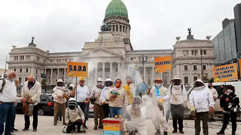 La Sociedad Argentina de Apicultores realizó un "abejazo" y reparto de miel frente al Congreso para visibilizar la situación de los polinizadores por el desarrollo del modelo agroindustrial "que genera pérdida de la biodiversidad y muerte".