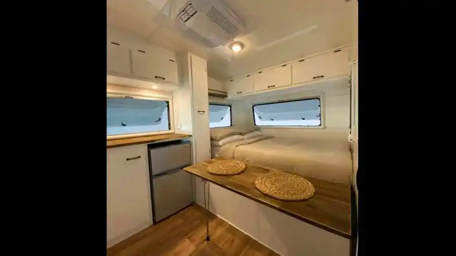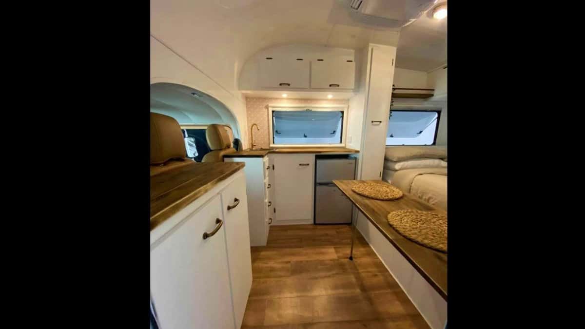 Tal como se deja ver en las imágenes, el camper cuenta con una amplia zona de estar con un fregadero, una heladera y varios compartimentos para guardar comida y equipaje.