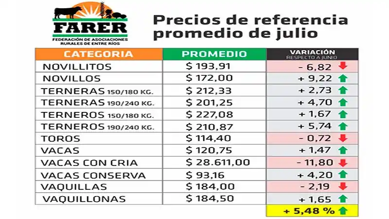 La Federación de Asociaciones Rurales de Entre Ríos (FARER) dio a conocer el informe mensual de precios de referencia del ganado vacuno, cuyos guarismos son obtenidos de los precios pagados en los remates a través de las firmas consignatarias que operan en la provincia.