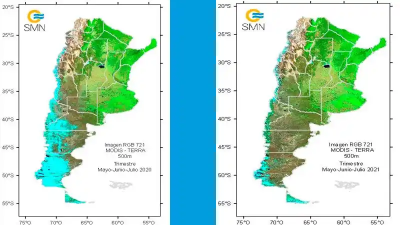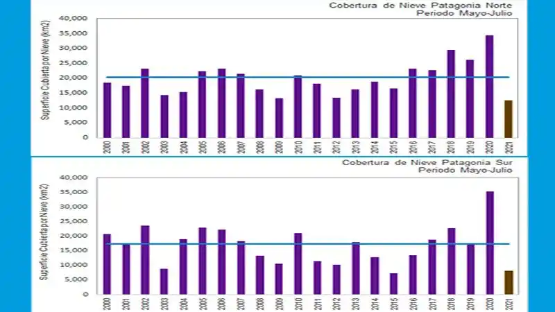 El déficit de precipitaciones también se refleja en la falta de nieve durante el trimestre mayo-junio-julio 2021 en la Patagonia y Cuyo (incluido el cordón cordillerano), la cual puede observarse por medio de imágenes satelitales si comparamos con el mismo trimestre pero del año 2020: En detalle, se marca en el 2021 una gran disminución de la superficie con nieve, en especial la región patagónica.