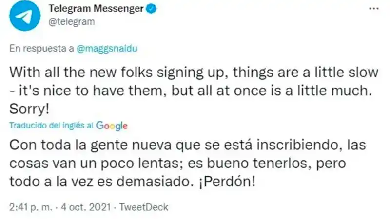 Tal fue la magnitud del incidente que Telegram, quizás la principal alternativa a WhatsApp en mensajería, también sufrió problemas, pero por la llegada masiva de nuevos usuarios.