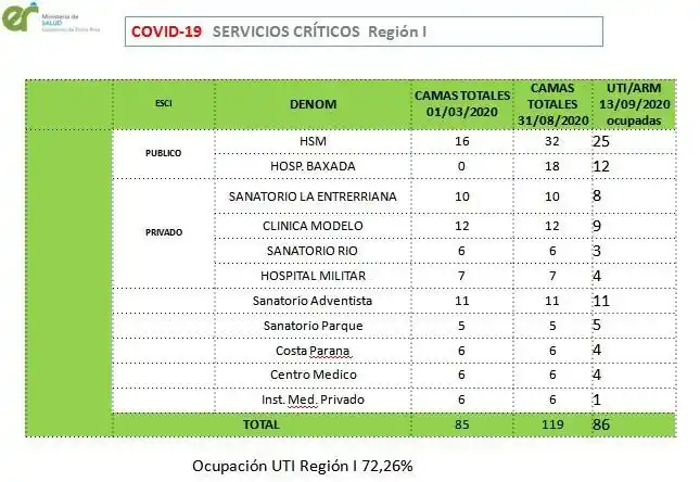 Es el número que se desprende del " Terapia Intensiva UTI" elaborado al mediodía de este domingo 13 de septiembre por el Ministerio de Salud de Entre Ríos.