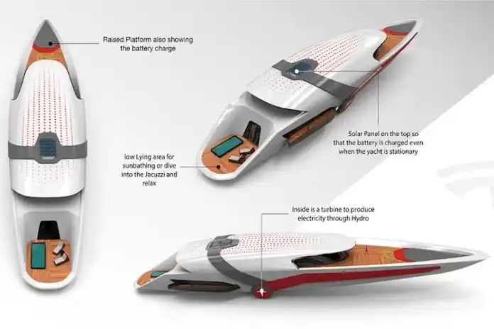 Con respecto a su propulsión, un enorme panel solar se encargará de recolectar energía para cargar las dos baterías de litio que alimentan a la embarcación. A su vez, la turbina del yate tomará todas las olas y movimientos entrantes y los transformará en energía.