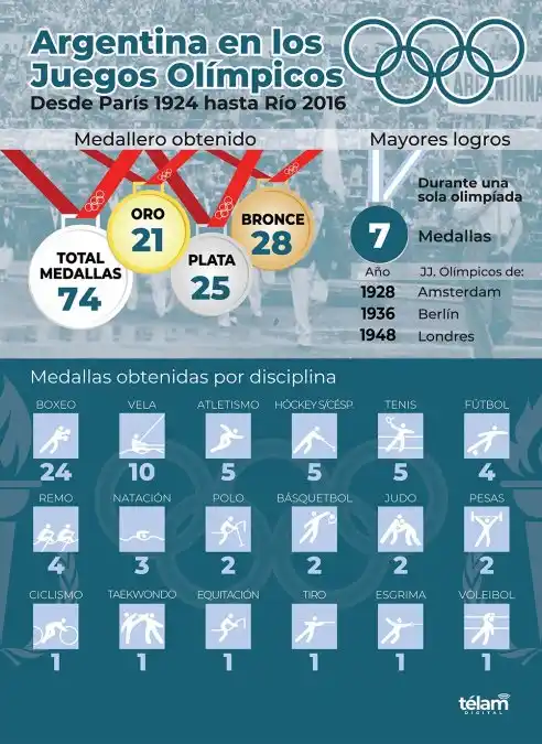 El deporte argentino consiguió 74 medallas en 18 disciplinas a lo largo de toda la historia de los Juegos Olímpicos, cifra que intentará engrosar en la edición Tokio 2020 que se celebrará del 23 de julio al 8 de agosto.