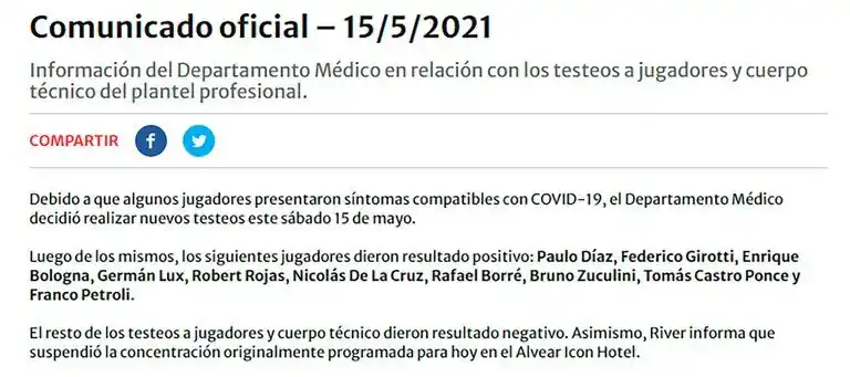 Luego de los nuevos testeos y contrapruebas por los síntomas que presentaron muchos jugadores, la institución de Núñez publicó un parte oficial con los apellidos que quedaron aislados por ser casos positivos: los arqueros Enrique Bologna, Germán Lux y Franco Petroli, los defensores Paulo Díaz y Robert Rojas, los mediocampistas Nicolás De La Cruz, Bruno Zuculini y Tomás Castro Ponce, y los delanteros Rafael Santos Borré y Federico Girotti. En tanto, el cuerpo técnico y médico decidió suspender la concentración originalmente programada para hoy en el Alvear Icon Hotel.