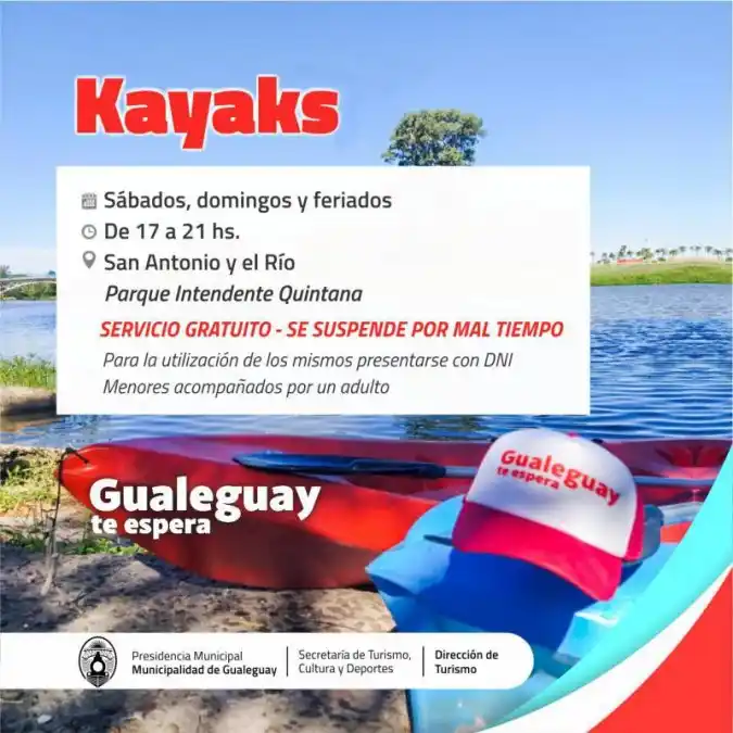 El sábado 13, domingo 14, y lunes 15, de 17:00 a 21:00 hs. se podrá disfrutar de forma gratuita, el servicio de kayaks ubicado en el Reservorio (Parque "Intendente Quintana").