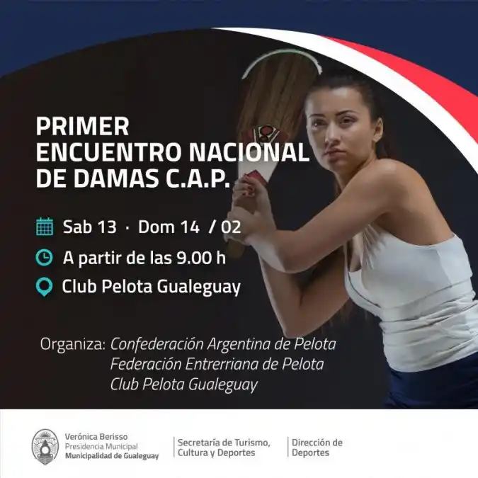 "El Sábado 13 y domingo 14, a partir de las 9:00 hs. se disputará el Campeonato Argentino Femenino de Pelota a Paleta. Este 1° Encuentro Nacional de Damas, se realizará en la cancha abierta y cerrada del Club Pelota Gualeguay, y está organizado por la Confederación Argentina de Pelota, la Federación Entrerriana de Pelota, y Club Pelota Gualeguay. Allí, estarán presentes, las mejores exponentes de esta disciplina deportiva en nuestro país".