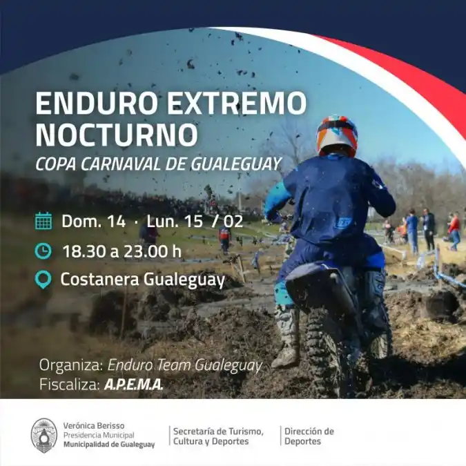 "Este domingo 14 y Lunes 15, en la Costanera, desde las 18:30hs, se desarrollará la 1° Fecha de Enduro Extremo Nocturno llamado este año ´Copa Carnaval de Gualeguay`. Este Torneo, libre y gratuito, está organizado por el Enduro Team Gualeguay, la fiscalización de la Asociación de Pilotos Entrerrianos de Motos y Autos (APEMA), con la colaboración de la Secretaría de Turismo, Cultura y Deportes del Municipio, a través de su Dirección de Deportes".