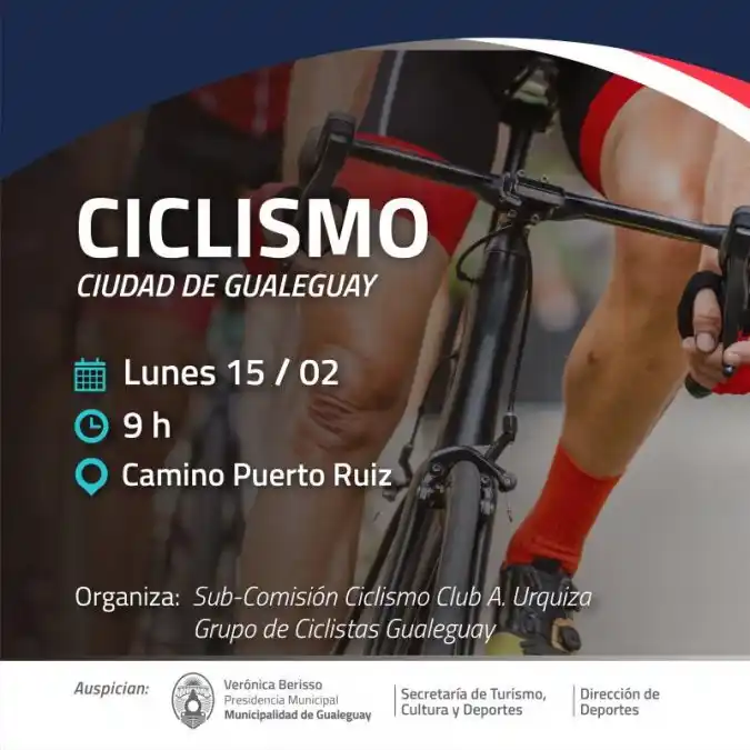 "El Lunes 15, desde las 9:00 hs se llevará a cabo una nueva fecha de Ciclismo, donde el recorrido será el camino a Puerto Ruiz. Este evento deportivo está organizado por la Sub Comisión de Ciclismo del Club Urquiza y un grupo de ciclistas de Gualeguay".