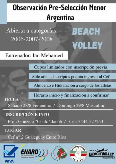 Volviendo a la actividad del CEF manifestó "...hablando de Selección Argentina, para el 28 y 29 de Agosto viene a Gualeguay el entrenador Ian Mehamed de Mar del Plata para realizar una observación de las categorías 2006, 2007 y 2008 en vista a lo que será un Campus en el CENARD con miras al preseleccionado de los Juegos Olímpicos de la Juventud, estará en el CEF, ya están abiertas las inscripciones para los interesados e inclusive se está realizando la promoción a nivel provincia y país de este evento, observación que será el sábado 28 para mujeres y el domingo 29 para varones......"