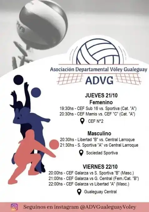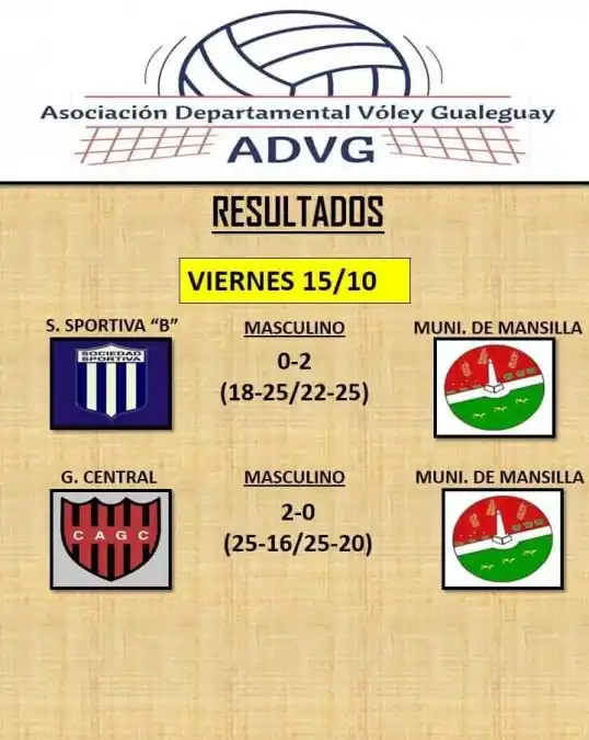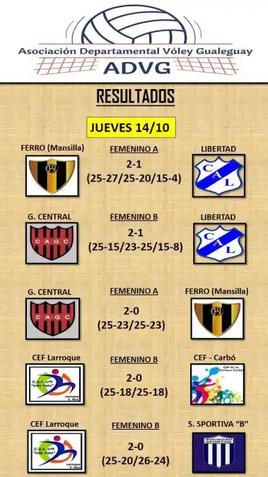 Con mucho entusiasmo prosiguen la disputa de los torneos de la Asociación Departamental de Voley Gualeguay en donde no solamente participan equipos locales sino también de la zona de influencia y los resultados registrados la semana pasada fueron los siguientes.