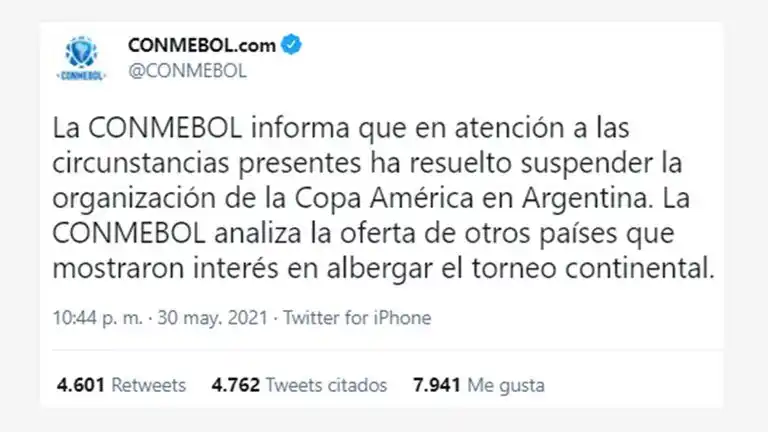 "La Conmebol informa que en atención a las circunstancias presentes ha resuelto suspender la orglanización de la Copa América en Argentina. La Conmebol analiza la oferta de otros países que mostraron interés en albergar el torneo continental. En la brevedad se anunciarán novedades en este sentido". A través de un comunicado en su cuenta de Twitter, la Confederación Sudamericana anunció que el certamen continental no se desarrollará en territorio argentino.