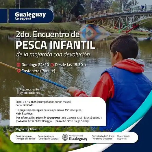2do Encuentro de Pesca Infantil El día 24 de octubre, a partir de las 15.30 h, se realizará en la Costanera de nuestra ciudad el 2do Encuentro de Pesca Infantil de la mojarrita con devolución.