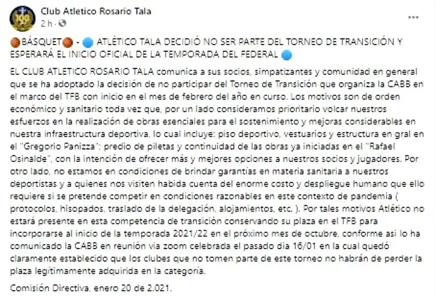 En medio de la incertidumbre, se bajó un equipo entrerriano, en la mañana de este miércoles, uno de ellos, Atlético Tala, informó su baja de Torneo Federal