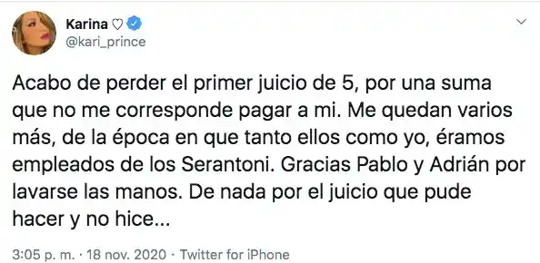En los últimos días, Karina La Princesita explotó en su cuenta de Twitter con unos mensajes cargados de bronca e indignación tras haber pedido un juicio millonario contra uno de sus músicos. En las publicaciones, la cantante tropical apuntó contra los hermanos Serantoni, Adrián y Pablo, quienes fueron sus ex productores y según sus palabras, "se lavaron las manos" ante este escándalo dejándola a ella como única responsable y con la obligación de abonar el monto perdido ante la Justicia.
