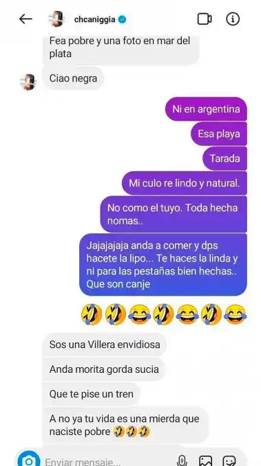 La conversación siguió con insultos, frases discriminatorias y mensajes repudiables. "Fea, pobre y una foto en Mar del Plata", le dijo la ex participante del Cantando 2020. La seguidora le respondió: "Ni en Argentina esa playa, tarada. Mi culo es re lindo y natural, no como el tuyo que estás toda hecha. Ja, ja, ja, andá a comer y después hacete la lipo... Te hacés la linda y ni las pestañas tenés bien hechas, que son de canje".