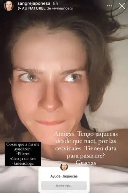 Revelando sus afecciones al público, la pareja de Benjamín Vicuña aclaró que sufre de intensos dolores de cabeza, y pidió algunas soluciones naturales, sin tener que acudir a una medicación crónica: "Amigxs, tengo jaquecas desde que nací por las cervicales. ¿Tienen data para pasarme?".