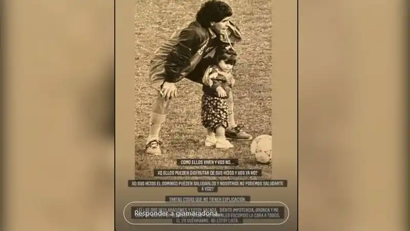 El domingo 20 de junio será la primera vez que el clan Maradona pase el Día del Padre sin el Diez, la piedra angular de su círculo más íntimo y querido. Gianinna no pudo ocultar su angustia y manifestó en una historia de Instagram: "¿Cómo viven ellos y vos no? ¿Por qué ellos pueden disfrutar de sus hijos y vos ya no? ¿Por qué sus hijos el domingo pueden saludarlos y nosotros no podemos saludarte a vos?".