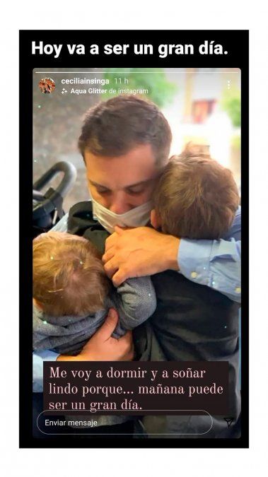 Horas antes, Diego y Cecilia habían anticipado este momento: "Me voy a dormir y a soñar lindo porque... mañana puede ser un gran día", escribió ella sobre una imagen en la que el periodista abraza a los nenes. "Hoy va a ser un gran día", reafirmó él al compartir la foto.