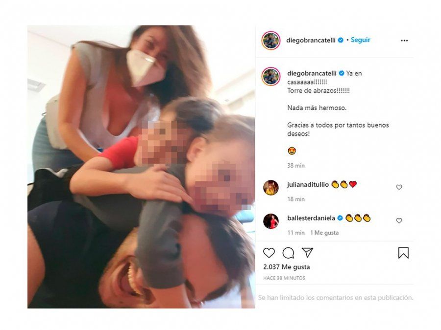 "¡Ya en casaaaa!". Efusivo, aunque escueto en comparación con cómo venía narrando su internación, Diego Brancatelli anunció la vuelta a su hogar. En la tarde del viernes lo contó a través de un posteo de Instagram junto a una tierna postal del reencuentro familiar: una "torre de abrazos" con su mujer, Cecilia Insigna, y sus hijos Valentín y Luca.