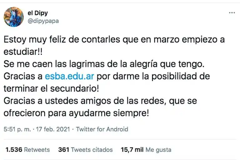"Estoy muy feliz de contarles que en marzo empiezo a estudiar! Se me caen las lágrimas de la alegría que tengo", escribió en Twitter El Dipy, un par de días después de compartir con Teleshow una extensa charla en la que había expresado públicamente su deseo de terminar la escuela secundaria. "Gracias a esba.edu.ar por darme la posibilidad de terminar el secundario! Gracias a ustedes, amigos de las redes, que se ofrecieron para ayudarme siempre!", agregó el músico cuyo nombre completo es Adrián Martínez en relación a los múltiples mensajes de apoyo que recibió después de comentar la novedad.