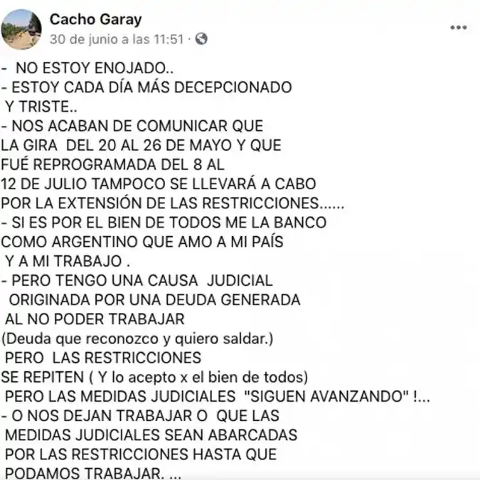 "Si es por el bien de todos, me la banco como argentino que amo a mi país y a mi trabajo. Pero tengo una causa judicial originada por una deuda generada al no poder trabajar. (Deuda que reconozco y quiero saldar)", agregó en el posteo que tiene un par de días. Y reflexionó: "Pero las restricciones se repiten y lo acepto por el bien de todos. Pero las medidas judiciales siguen avanzando. O nos dejan trabajar o que las medidas judiciales sean abarcadas por las restricciones hasta que podamos trabajar..."