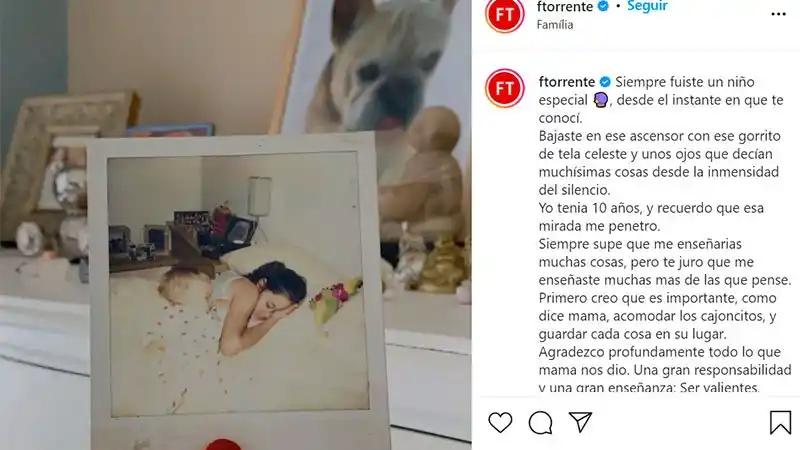 Sus revelaciones causaron impacto. Este domingo su hermana Flor Torrente hizo un dulce posteo de apoyo para Toto. "Siempre fuiste un niño especial, desde el instante en que te conocí. Bajaste en ese ascensor con ese gorrito de tela celeste y unos ojos que decían muchísimas cosas desde la inmensidad del silencio. Yo tenía 10 años, y recuerdo que esa mirada me penetró", comenzó Flor.