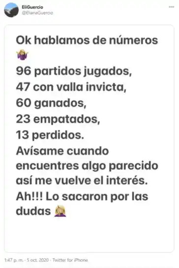 Con el objetivo de sentar su posición y tratar de fundamentarla en estadísticas, Guercio escribió: "96 partidos jugados, 60 ganados, 23 empatados y 13 perdidos. Avisame cuando encuentres algo parecido así me vuelve el interés. ¡Ah! Lo sacaron por las dudas".
