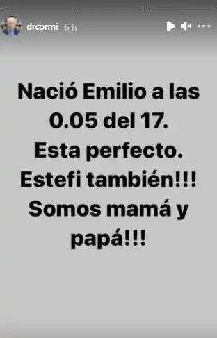 "Nació Emilo, a las 00.05 del 17. Está perfecto. Estefi también. Somos mamá y papá", escribió el profesional de la salud, con el corazón repleto de amor.