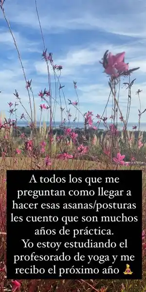 Eso abrió las puertas a la confesión de Evangelina, que en otra historia escribió un texto revelador. "A todos los que me preguntan cómo llegar a hacer esas asanas/posturas les cuento que son muchos años de práctica. Yo estoy estudiando el profesorado de yoga y me recibo el año próximo", confirmó la exvedette.