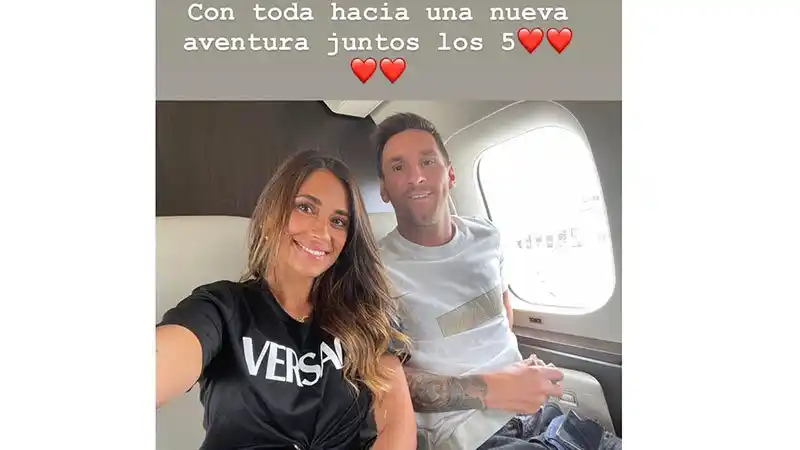 "Con todo hacia una nueva aventura juntos los 5", escribió Antonela junto a foto con Messi desde el avión que los trasladará a París.