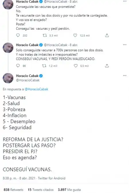 "¿Conseguiste las vacunas que prometiste? No. Te vacunaste con las dos dosis y por no cuidarte te contagiaste. ¿Y vos sos el enojado? ¿Posta? Conseguí las vacunas y pedí perdón", escribió en el primer mensaje. "Sólo conseguiste vacunar a 700k personas con las dos dosis. ¿Y nos tratas de imbéciles e irresponsables? CONSEGUÍ VACUNAS, Y PEDÍ PERDÓN MALEDUCADO", continuó en el segundo, enfatizando con mayúsculas. Y, el tercero, hizo un listado que se lee como las prioridades que debería ejecutar el gobierno en lugar de su agenda actual: "1-Vacunas 2-Salud 3-Pobreza 4-Inflacion 5-Desempleo 6-Seguridad ¿REFORMA DE LA JUSTICIA? ¿POSTERGAR LAS PASO? ¿PRESIDIR EL PJ? ¿Eso es agenda? CONSEGUÍ VACUNAS".