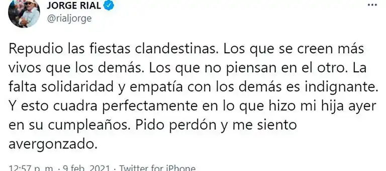 Jorge Rial escribió en su cuenta de Twitter un fuerte mensaje sobre el festejo de cumpleaños de su hija Morena: "Repudio las fiestas clandestinas. Los que se creen más vivos que los demás. Los que no piensan en el otro. La falta solidaridad y empatía con los demás es indignante. Y esto cuadra perfectamente en lo que hizo mi hija ayer en su cumpleaños. Pido perdón y me siento avergonzado".