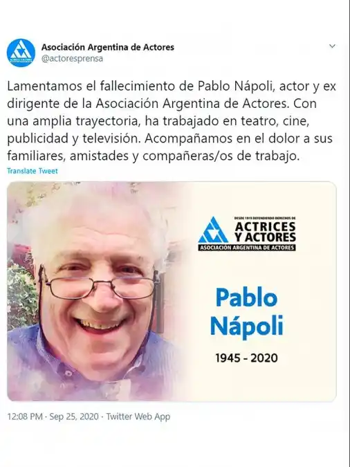A través de sus cuentas oficiales en redes sociales, Actores comunicó con un profundo dolor la defunción y a su vez mostró un sentido respecto y admiración por la persona, con palabras de admiración por alguien que no solo se encargó de actuar, sino que fue parte de la entidad. "Lamentamos el fallecimiento de Pablo Nápoli, actor y ex dirigente de la Asociación Argentina de Actores. Acompañamos en el dolor a sus familiares, amistades y compañeros/as de trabajo", reza la publicación de Actores en las redes sociales.