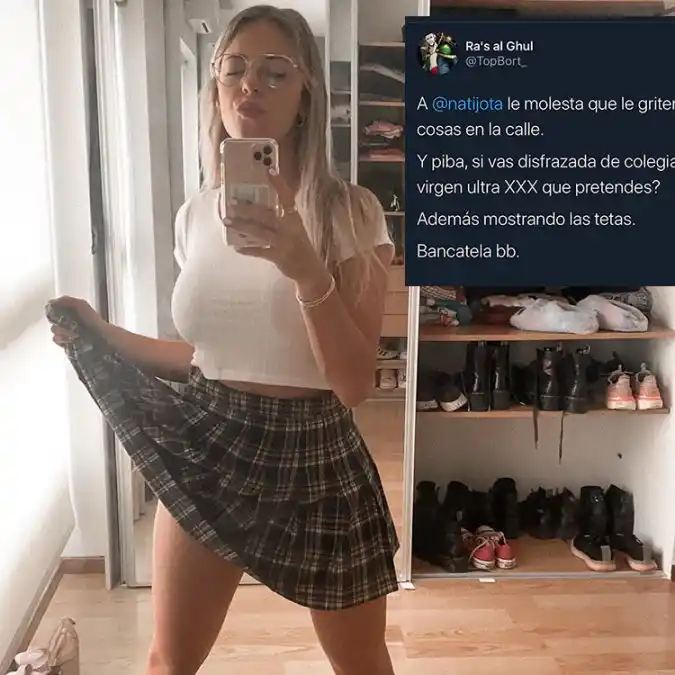 Pero además, en Twitter también recibió mensajes machistas. "A Nati Jota le molesta que le griten cosas en la calle. Y, piba, si vas disfrazada de colegiala virgen ultra XXX, ¿qué pretendés?", le escribió un usuario. "Además, mostrando las tetas. Bancátela, bebé", finalizó de manera recusable.