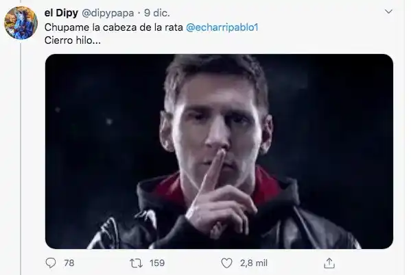 Pero el tema no terminó ahí. Porque el Dipy aprovechó el escándalo que se armó en las redes sociales para recordarle a Echarri la discusión que habían mantenido hace meses por Grimson. El cantante abrió un hilo recordado lo que le puso el galán en aquella oportunidad, sumó todos los tuits discriminadores del joven y cerró con una agresiva mención al actor: "Chupame la cabeza de la rata Echarri" y agregó una foto de Messi haciendo el gesto de "silencio".